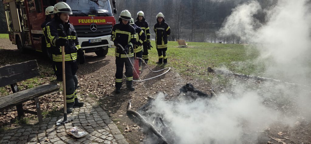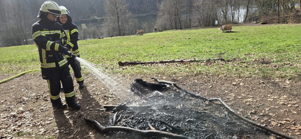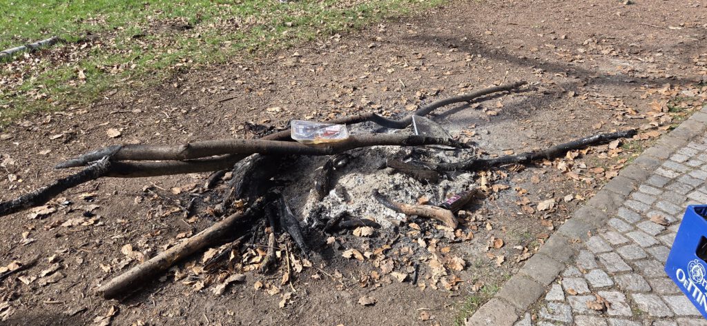 Spaziergänger meldeten ein unbeaufsichtigtes Lagerfeuer im Bereich der alten Grillhütte auf dem Gehweg. Das Feuer wurde mit Wasser abgelöscht. Die Polizei war vor Ort.