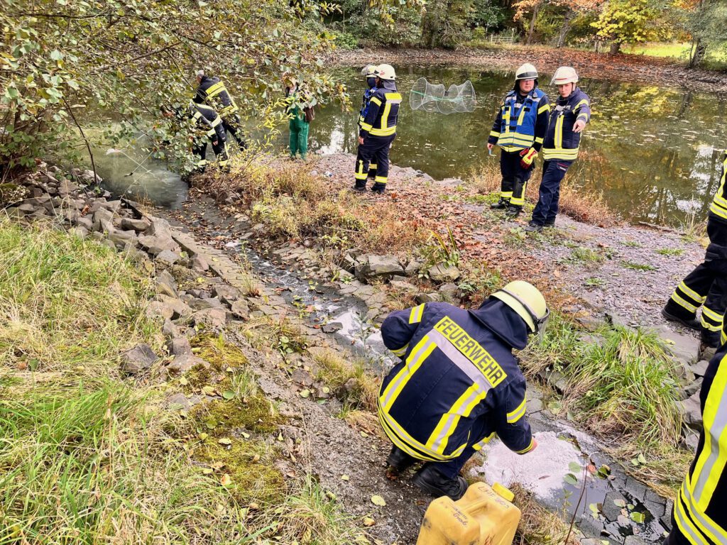 Gegen 17  Uhr erfolgte ein weiterer Alarm für die Löschbezirke Rohrbach und St. Ingbert-Mitte: Auf einem privaten Weiher am Geistkircher Hof war über einen Zulauf eine milchige Flüssigkeit in einen Weiher geflossen. Zur Eindämmung der Verunreinigung brachten die Einsatzkräfte mechanische Sperren, durch Bindemittel und Ölsperren im Zulauf aus. Die Feuerwehrleute führten verschiedene Tests durch und entnahmen Wasserproben. Nach ersten Einschätzungen handelte es sich vermutlich um Bohrmilch, eine Flüssigkeit, die bei Metallbearbeitungsprozessen verwendet wird. Nachdem die unmittelbare Gefahr eingedämmt war, übernahmen Polizei, der Abwasserbetrieb der Stadt St. Ingbert sowie das Landesamt für Umwelt- und Arbeitsschutz (LUA) die weiteren Ermittlungen zur Ursache und zum Verursacher. Die Feuerwehr St. Ingbert war mit rund 20 Einsatzkräften und mehreren Fahrzeugen im Einsatz. Quelle: Pressestelle FFw IGB